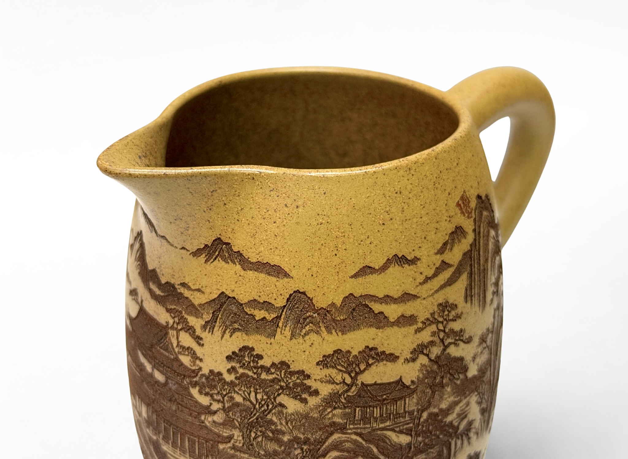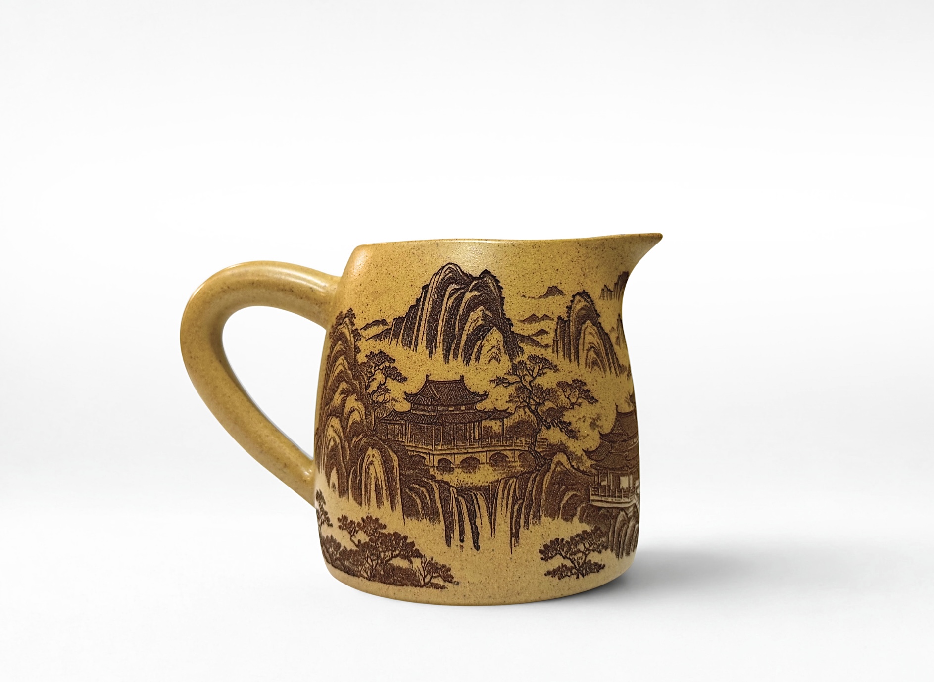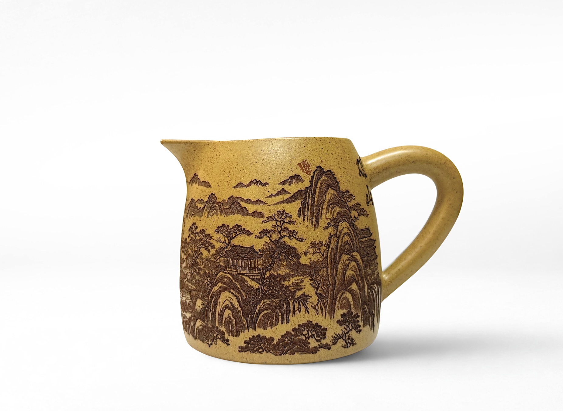 Chahai „Górska Świątynia” to wyjątkowy dzbanek do herbaty wykonany z gliny Yixing, cenionej w świecie herbaty za swoje właściwości i tradycję. Naczynie zostało pokryte dekoracyjną warstwą, dzięki czemu łączy naturalny charakter materiału z eleganckim wykończeniem. Zdobione szczegółowym pejzażem inspirowanym chińskim malarstwem – góry, drzewa i świątynia tworzą spokojną, kontemplacyjną scenę.