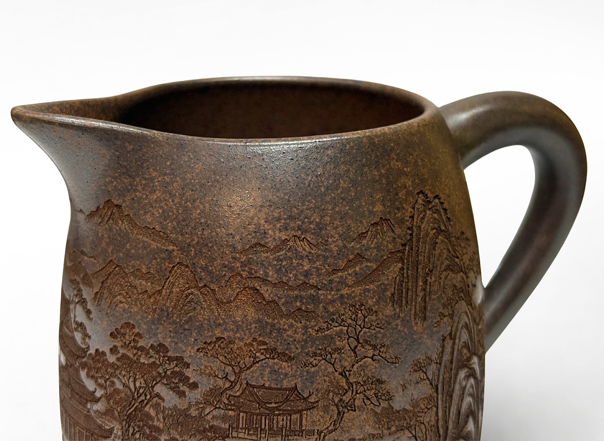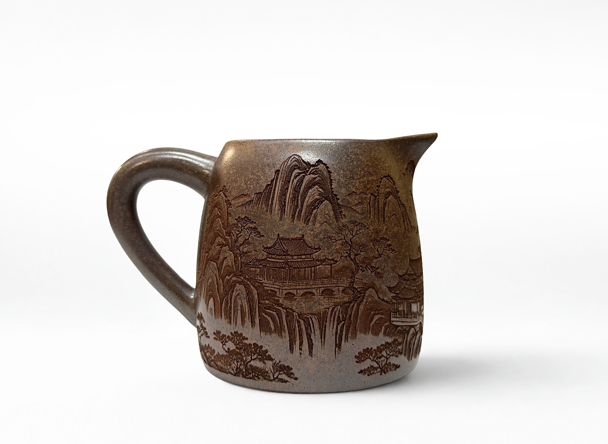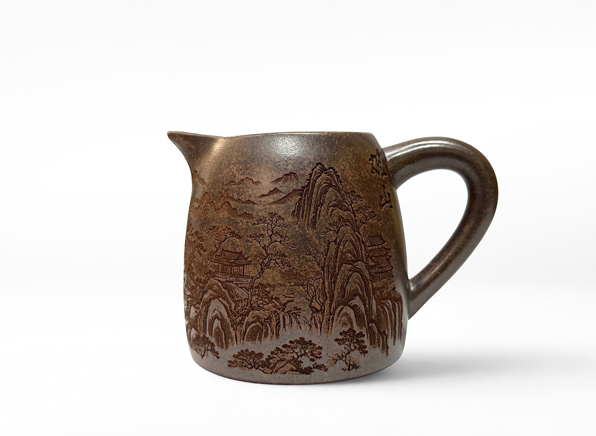 Chahai „Górska Świątynia” 325 ml wykonane z gliny Yixing wyróżnia się głębokim, ciemnym wykończeniem i subtelnym pejzażem górskim. Dzbanek łączy tradycyjny charakter z nowoczesną funkcjonalnością, zapewniając równomierne rozlewanie naparu. Idealny wybór dla miłośników gongfu cha i estetyki inspirowanej naturą.