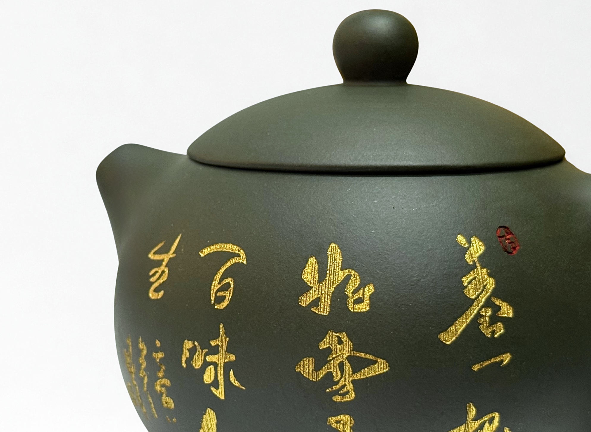 Powierzchnię czajnika zdobi złota kaligrafia, która nawiązuje do tradycyjnej filozofii i estetyki Dalekiego Wschodu. Tego typu zdobienia podkreślają nie tylko walory wizualne, ale także symboliczny charakter naczynia, które staje się częścią rytuału picia herbaty.