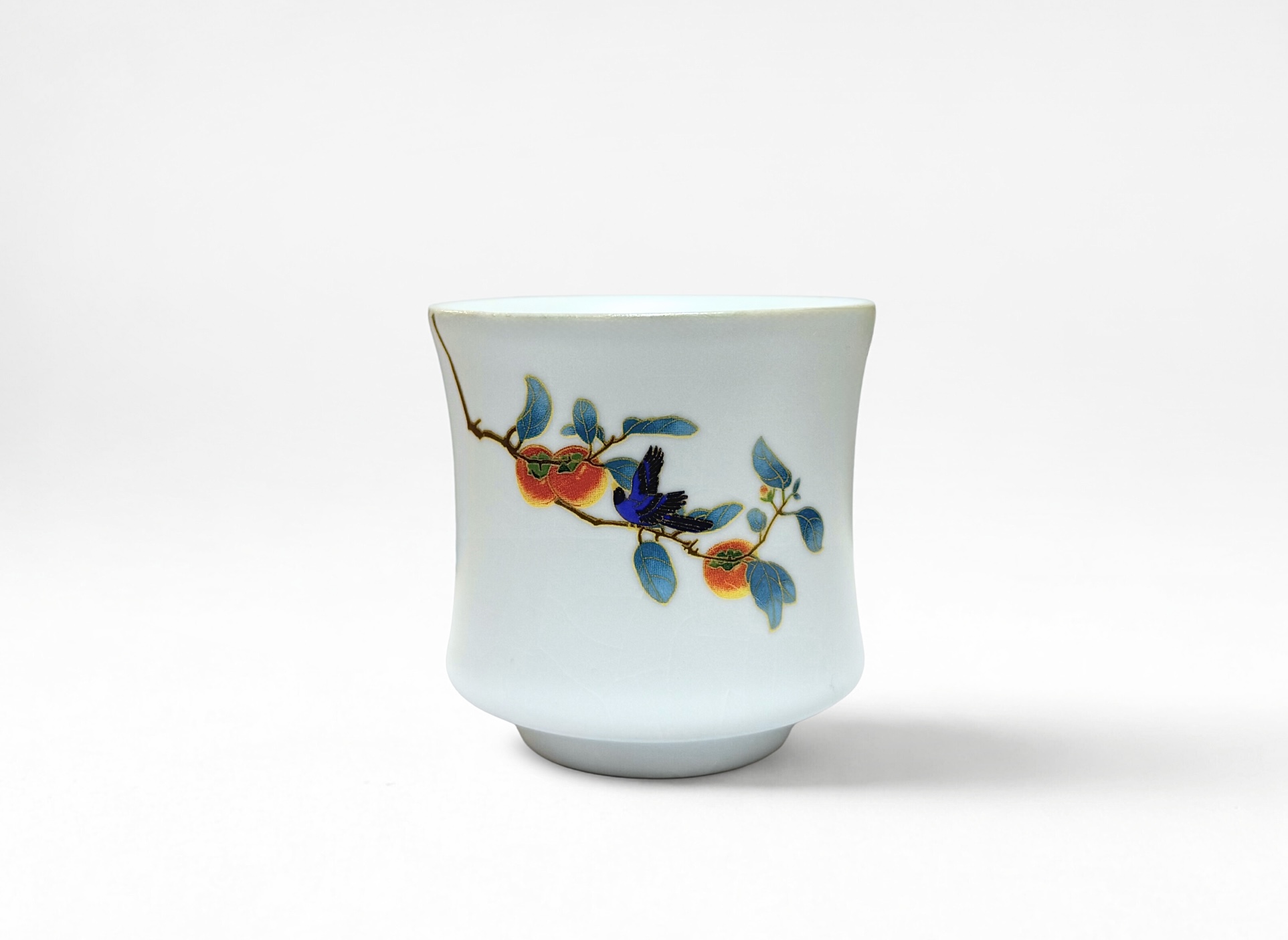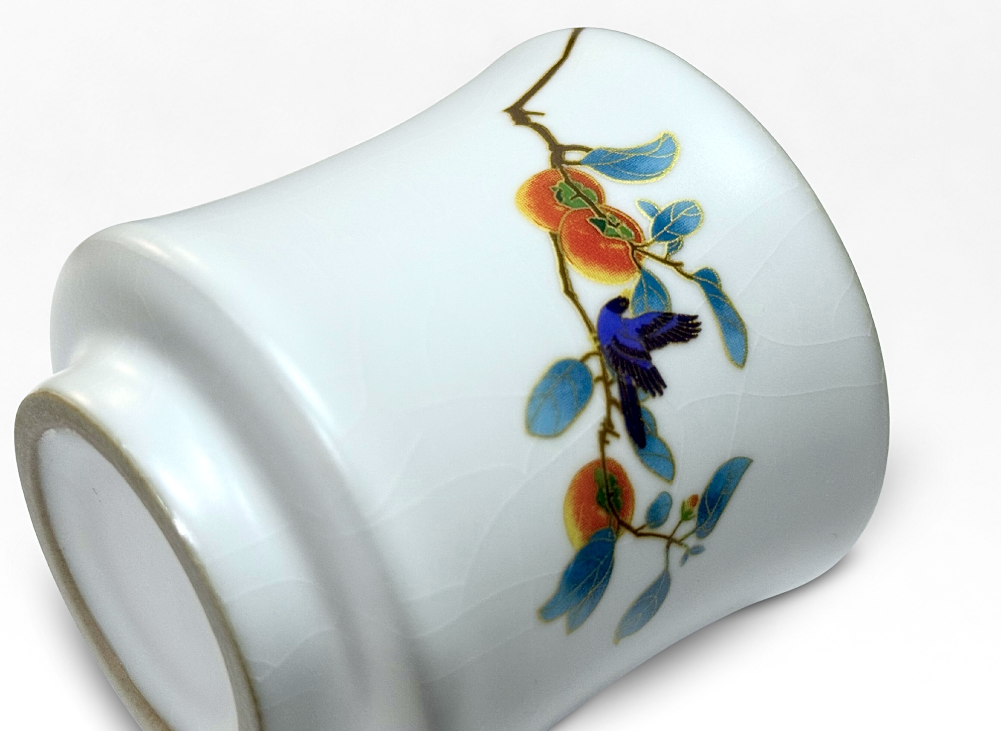 Czarka „Persimmon” to ceramiczna czarka o pojemności 100 ml, ozdobiona klasycznym motywem owocu kaki oraz ptaka siedzącego na gałęzi. W chińskiej symbolice kaki kojarzone jest z obfitością, spokojem i pomyślnością, natomiast ptak symbolizuje lekkość i harmonię z naturą. Dekoracja została naniesiona ręcznie w ciepłych odcieniach pomarańczy, zieleni i głębokiego błękitu, dzięki czemu całość prezentuje się lekko i naturalnie.