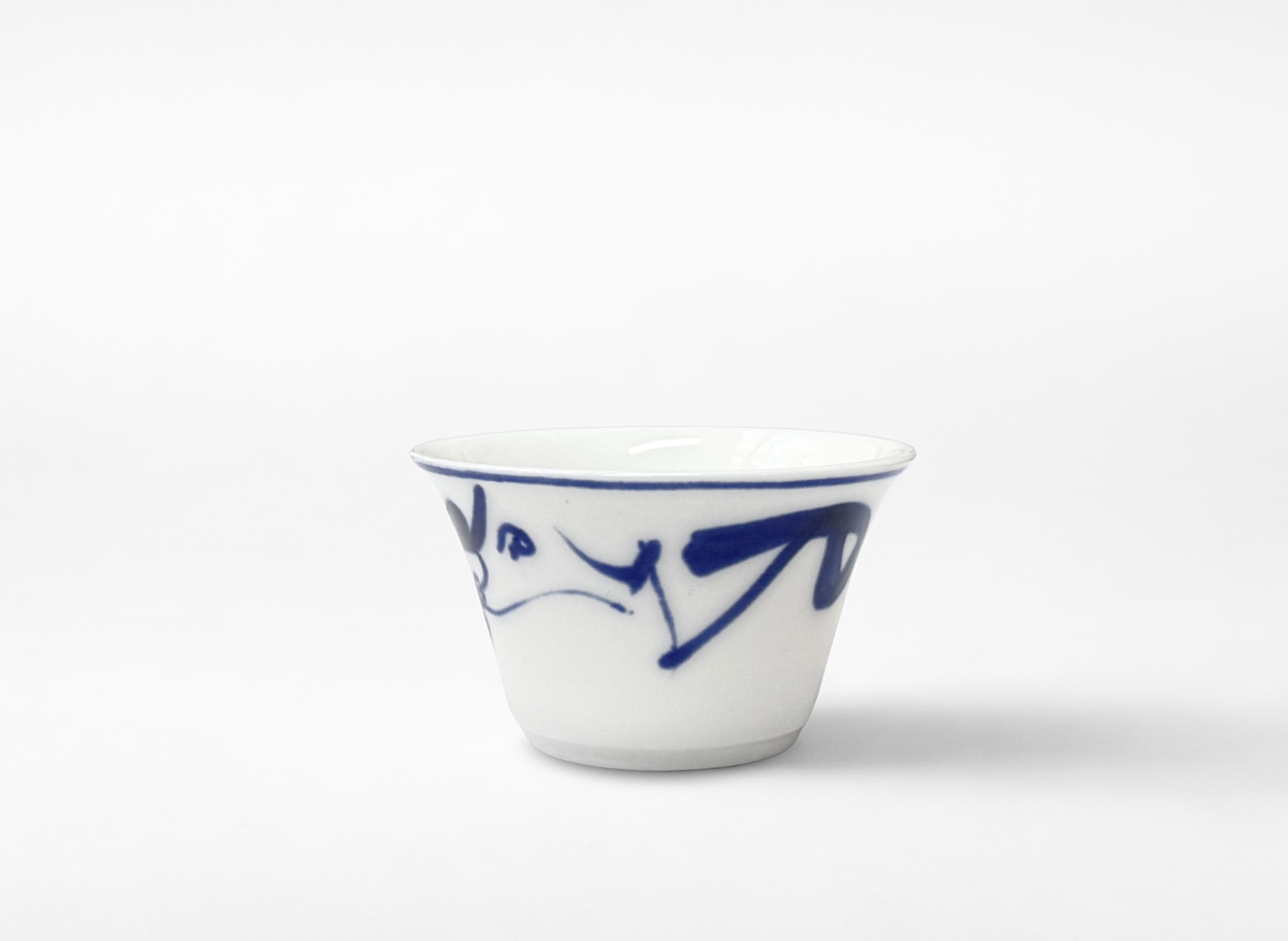 Czarka „Taniec Pędzla” to ceramiczna czarka o pojemności 40 ml, której dekor nawiązuje do swobodnego ruchu pędzla w tradycyjnej chińskiej kaligrafii. Intensywne, kobaltowe linie zostały naniesione ręcznie na jasną powierzchnię szkliwa, tworząc dynamiczną, ale oszczędną kompozycję. Dzięki temu każda czarka ma indywidualny charakter i nieco inny układ pociągnięć.