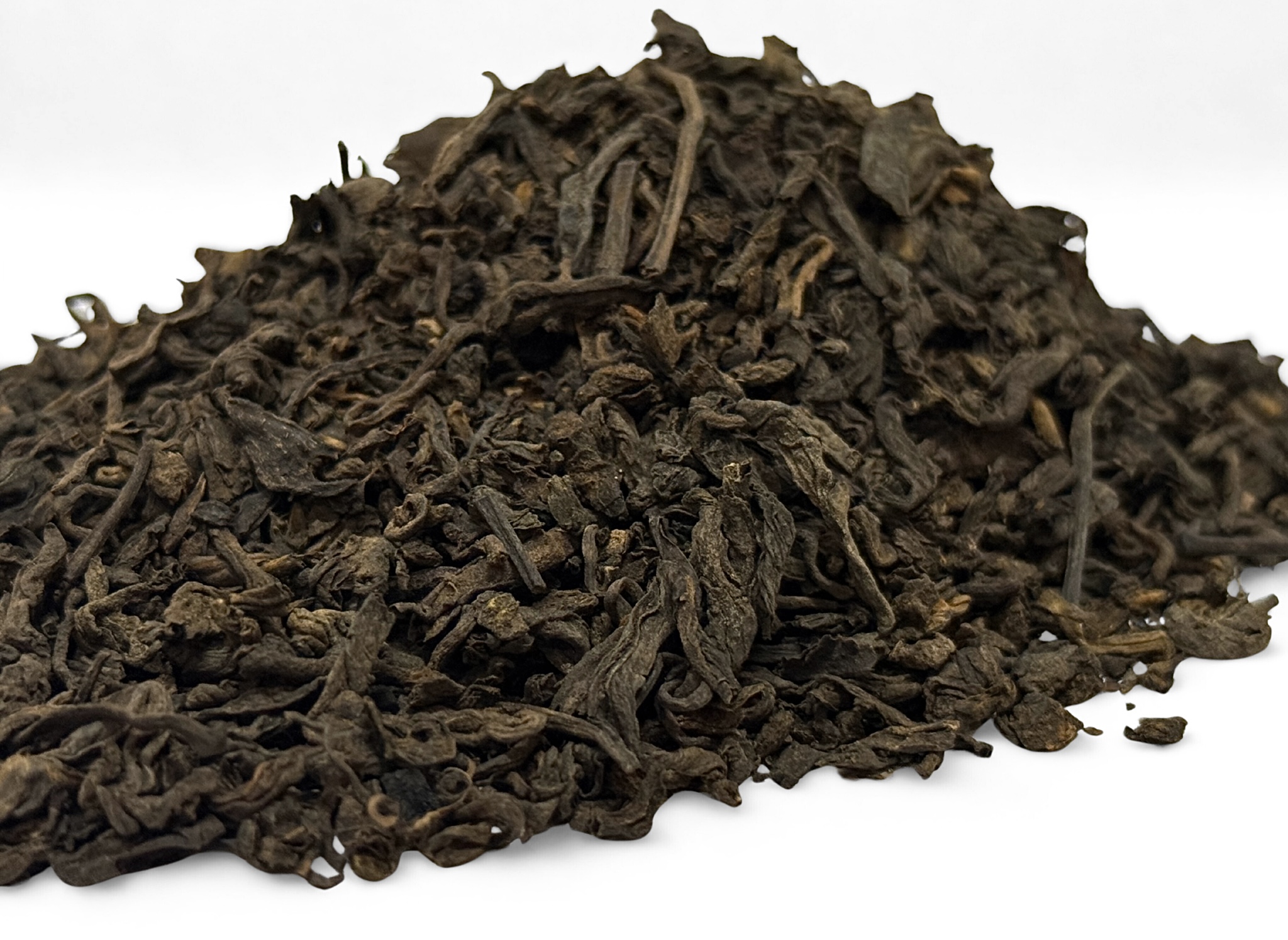 Liście mają postać niewielkich, równych, ciasno skręconych pasemek o ciemnym kolorze. Miejscami widoczne są drobne łodyżki, co jest naturalnym elementem tradycyjnego surowca z Menghai. Aromat suchego liścia jest czysty, miękki i wyraźny, z dominującą nutą drewna i orzechów oraz subtelnym akcentem przypraw.