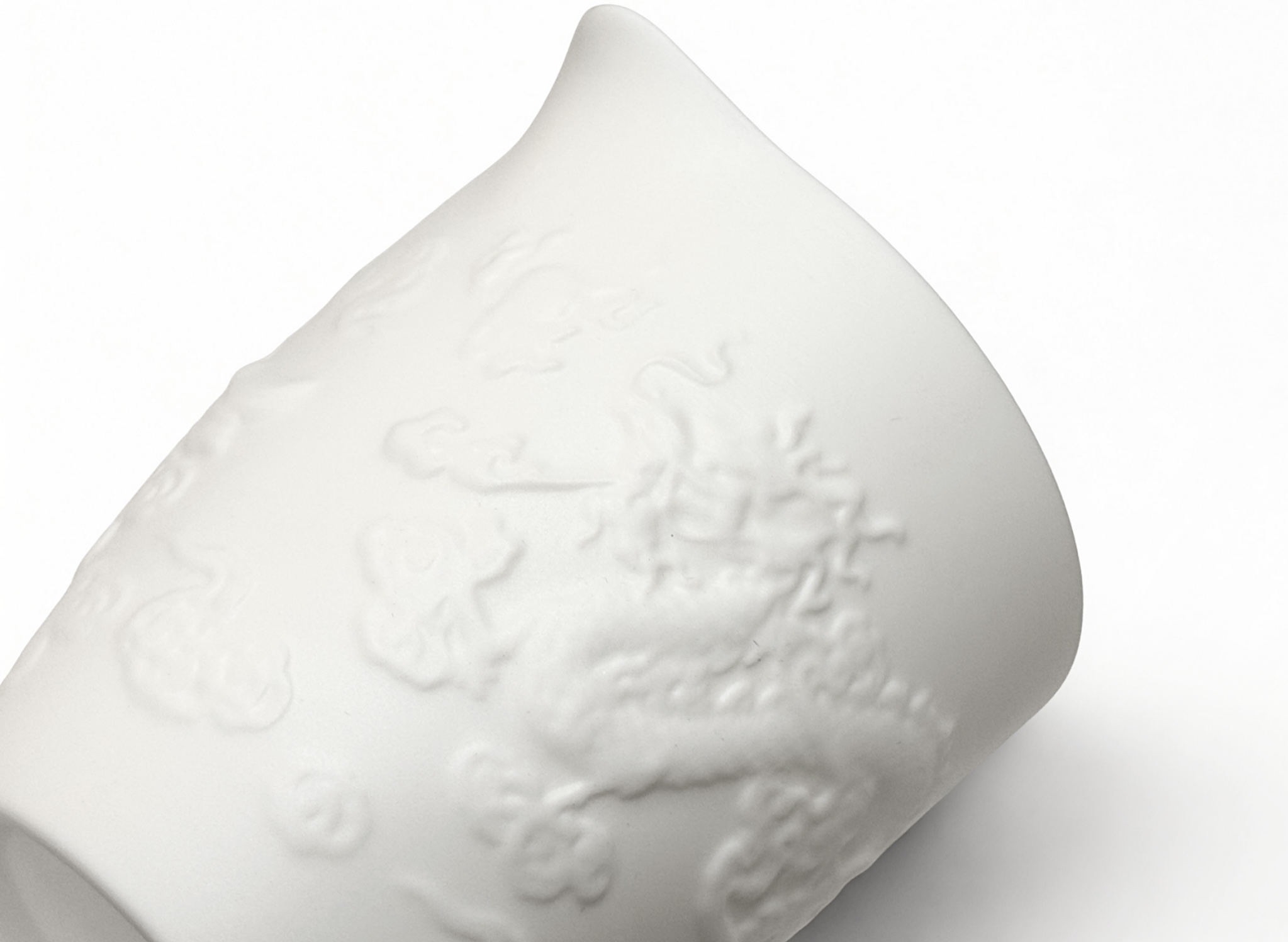 Porcelana zastosowana w zestawie „Biały Smok” jest neutralna smakowo i nieporowata. Nie pochłania aromatów, dzięki czemu pozwala w pełni oddać charakter każdej herbaty. Jasna, mlecznobiała powierzchnia ułatwia obserwację koloru naparu, co ma szczególne znaczenie przy parzeniu oolongów, herbat zielonych, białych oraz pu-erh. Reliefowy wzór smoka jest subtelny i wyczuwalny pod palcami, nie wpływając na komfort użytkowania.