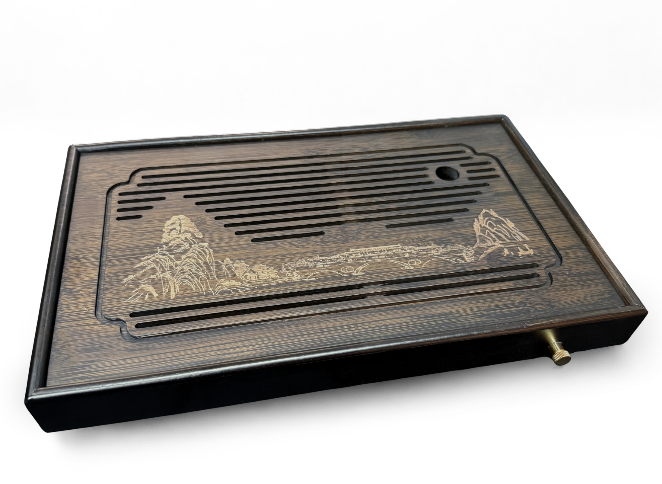 Bambus jest materiałem cenionym w akcesoriach herbacianych za trwałość, odporność na wodę oraz naturalną estetykę. Deska Shan Gong posiada zdejmowaną pokrywę z podłużnymi szczelinami, które skutecznie odprowadzają nadmiar wody do wewnętrznego zbiornika. Wbudowany odpływ z dołączonym wężykiem pozwala na komfortowe odprowadzanie wody do zewnętrznego naczynia, co znacząco ułatwia dłuższe sesje parzenia.