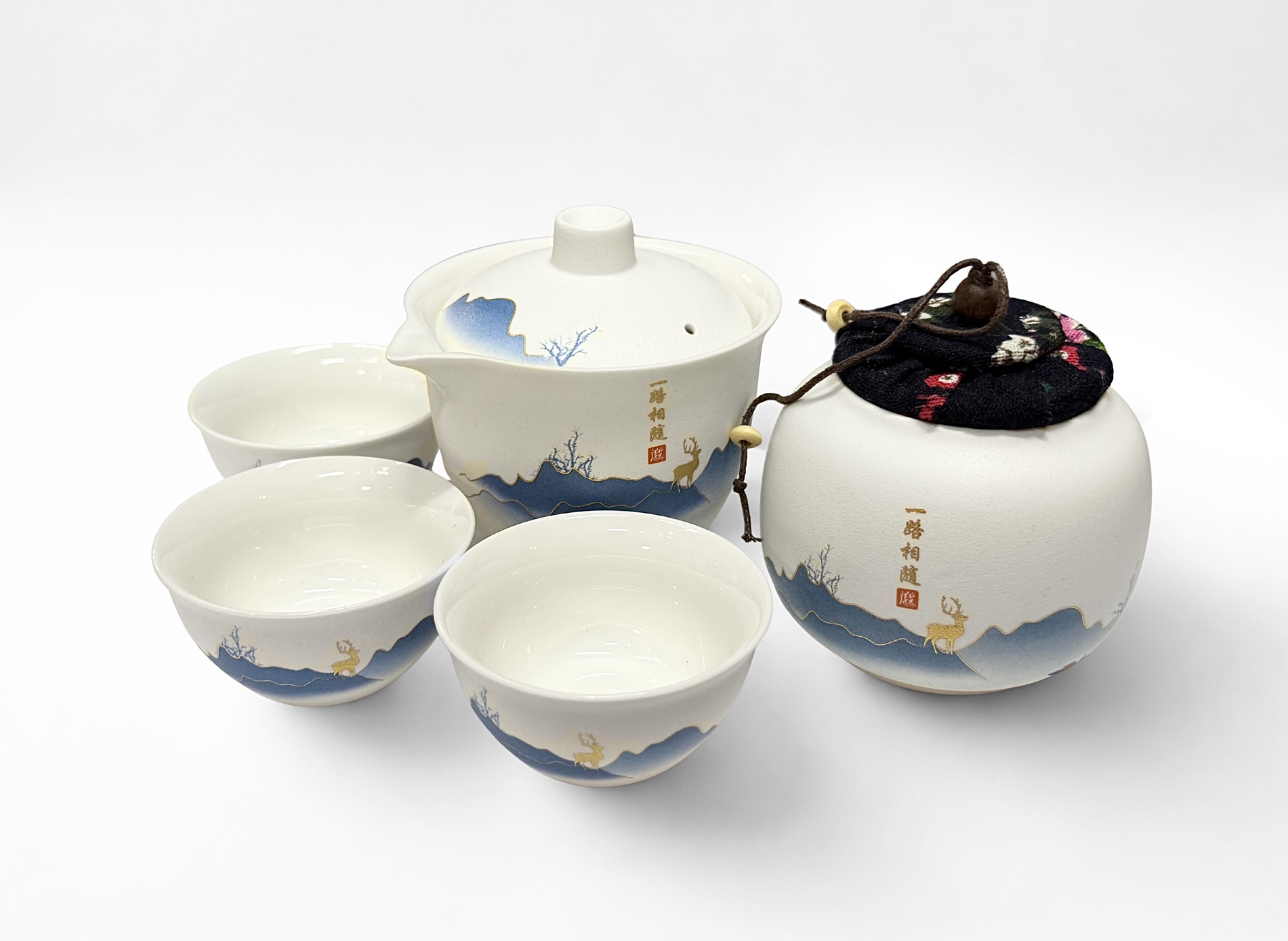 Цей красивий набір для церемонії поєднує традицію китайського чаю з практичним, сучасним підходом. «Олень і Гори» звертається до символіки спокою, споглядання та шляху до рівноваги. Ніжний матовий матеріал приємний на дотик, а делікатний синьо-золотий пейзаж гір і оленя привносить у церемонію красу природи.