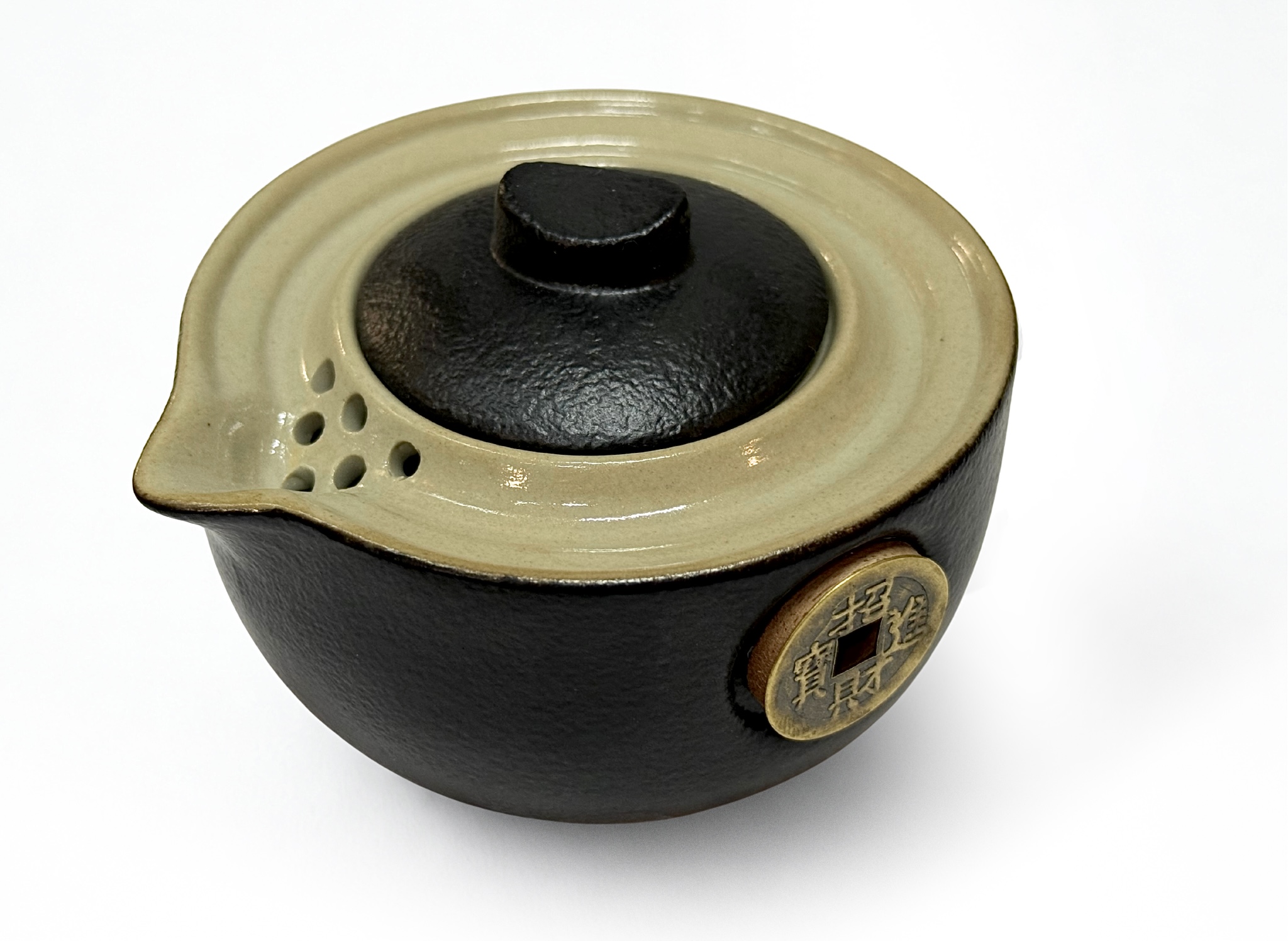 Чайний набір «Китайський кіт» — це поєднання естетики, символіки та функціональності, натхненне китайською культурою заварювання чаю. Керамічний набір відсилає до традиційних мотивів достатку й щастя, втілених в образі Кота Щастя. Чорний колір чайника у поєднанні із золотою монетою створює стриманий, елегантний контраст. Компактна форма робить набір ідеальним як для домашнього чайного ритуалу, так і для подорожей.